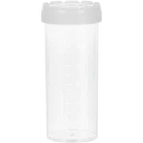 Container 120 ml, 105 x 44 mm, flat base, PP, with moulded graduation, with assembled PE cap NS / PK 250