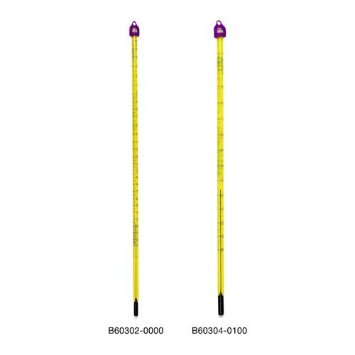 Easy-to-read thermometers with black printing on a bright yellow background. Filled with contrasting black, non-hazardous, Enviro-Safe liquid. Calibrated with NIST, DKD standards.