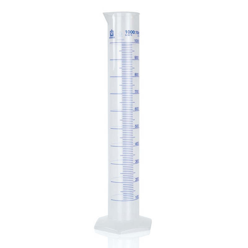 PP, high clarity. DIN 12 681 and ISO 6706. Calibrated to contain (TC, In). Exposure to temperatures up to 80 °C will not cause permanently exceeded error limits! Cleaning up to max. 60 °C is recommended to preserve marks and inscriptions.