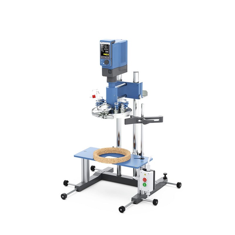 The system is particularly characterized by the stirrer mounting, which allows for a safe transfer of the higher motor torque. In addition, the overhead stirrer used allows the direction of rotation to be reversed, making this reactor system particularly suitable for aqueous solutions. The mixing of these solutions will be improved by the change in direction of rotation.